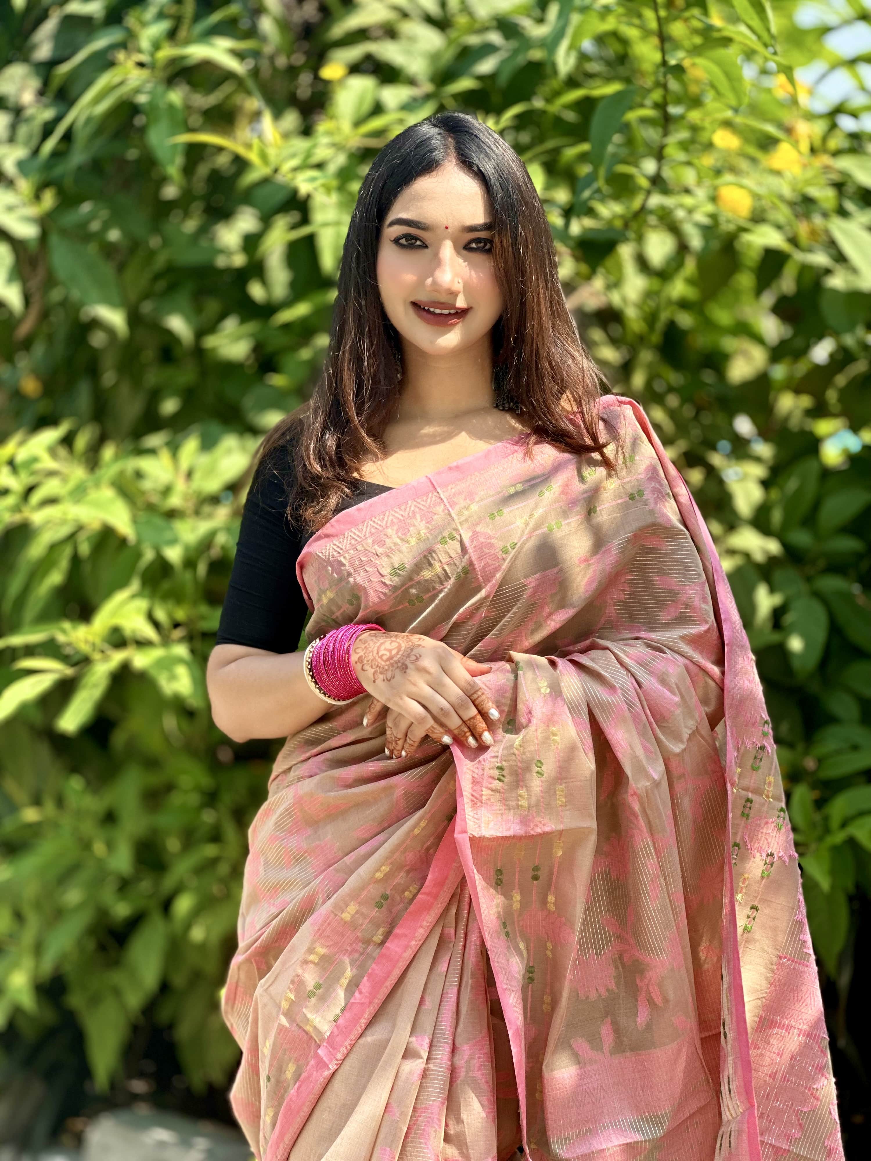 ম্যাটেরিয়ালঃ কাশ্মীরি চিকন সূতা দিয়ে জামদানি শাড়ী তৈরি করা হয়েছে।