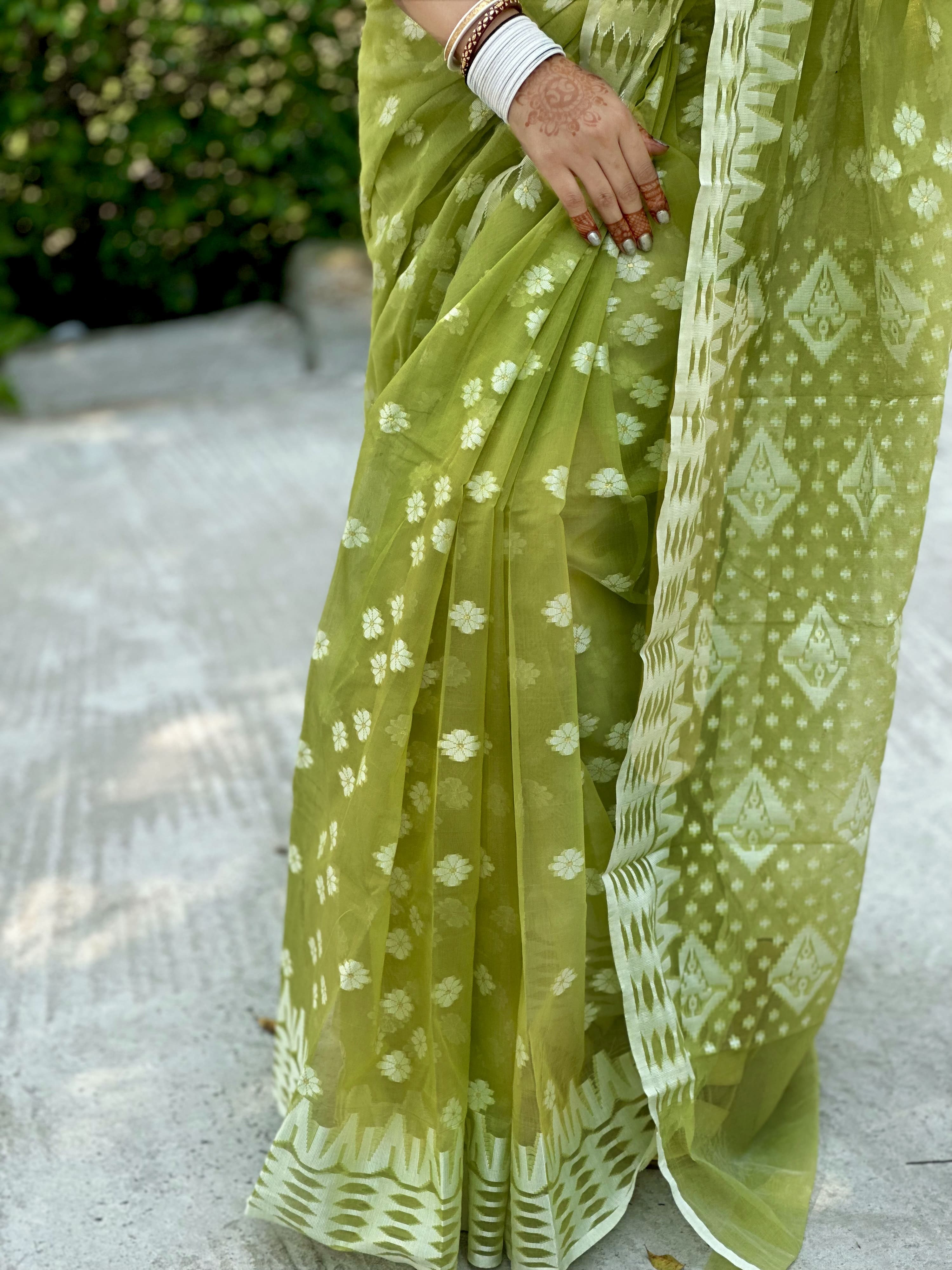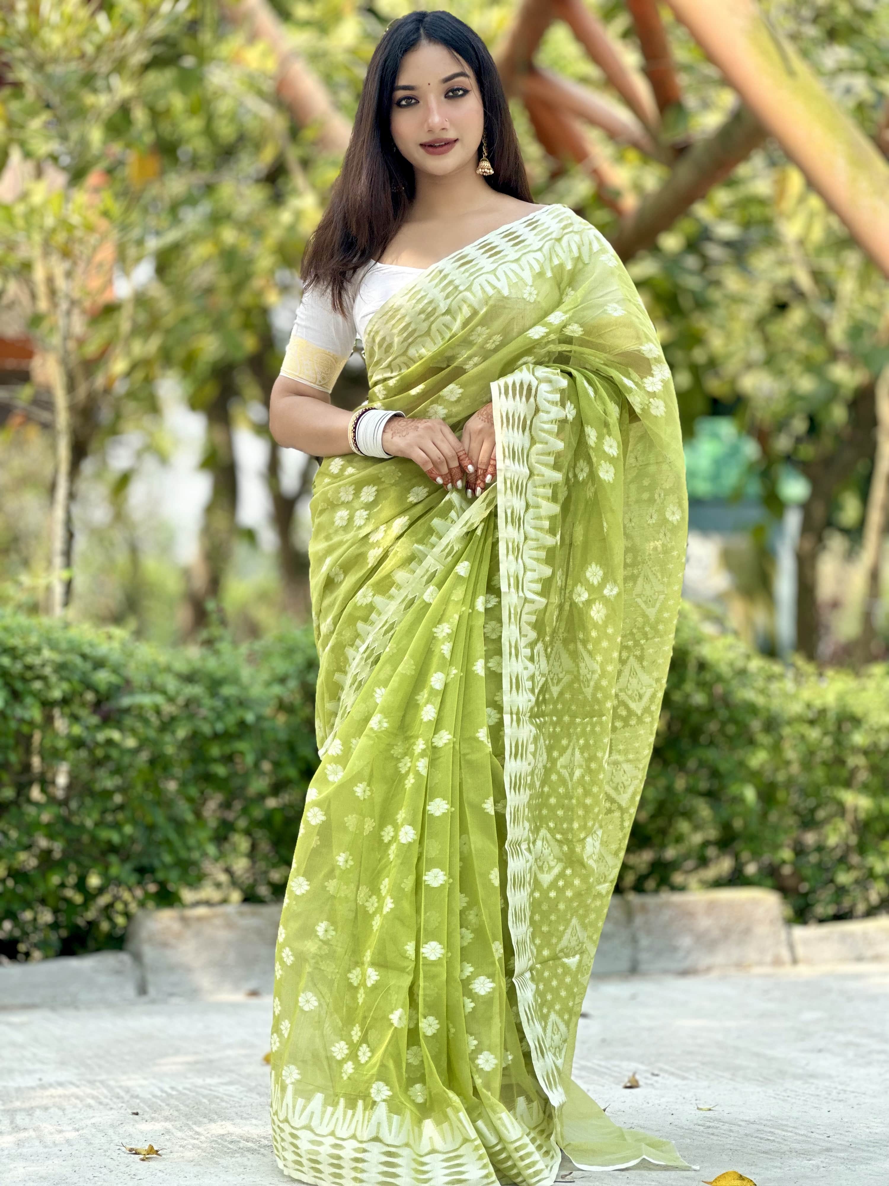 মসলিন জামদানি শাড়ীর এর মধ্যে অসাধারণ সূতায় এর কাজ করা।