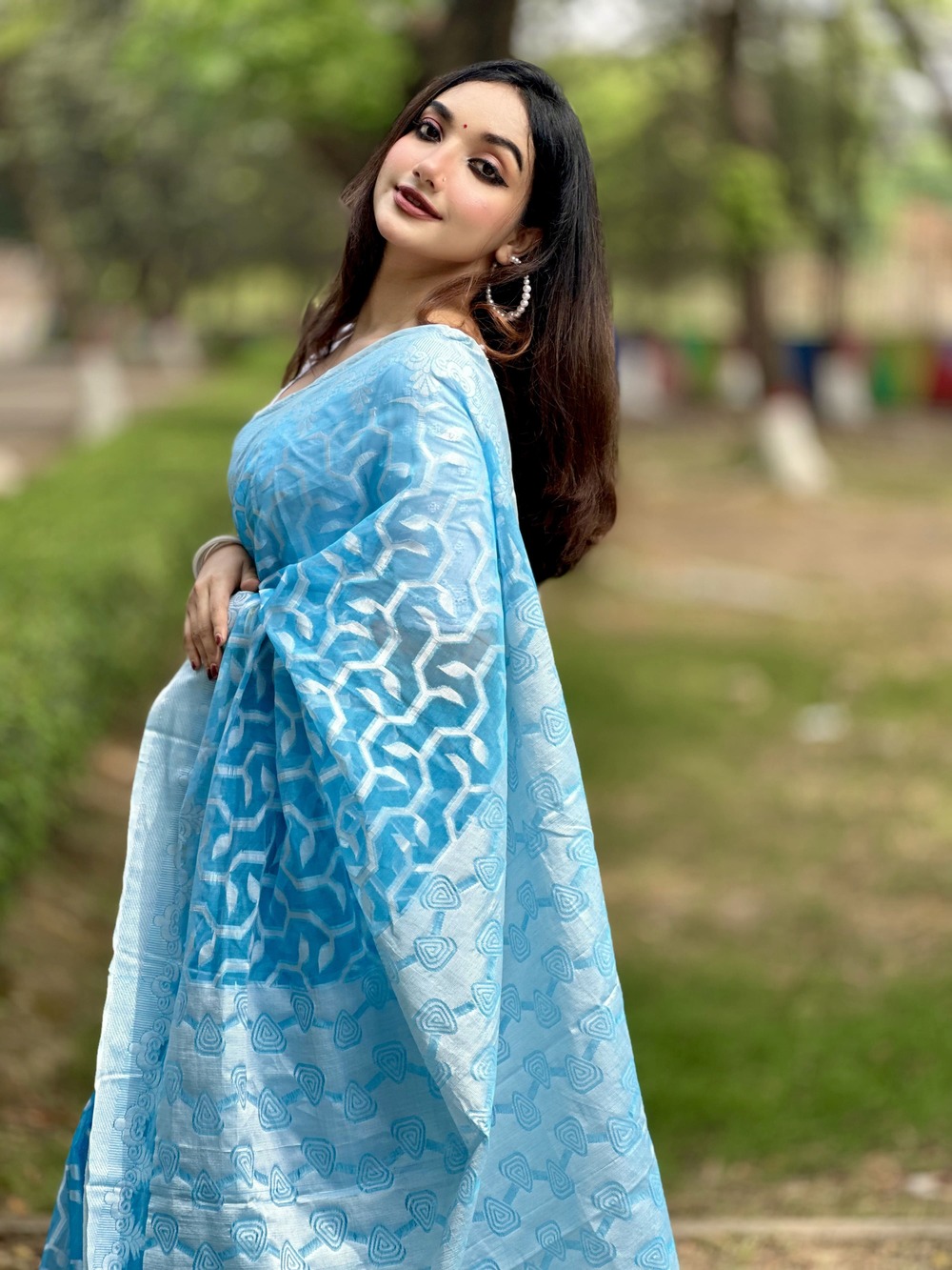 মসলিন জামদানি শাড়ীর এর মধ্যে অসাধারণ সূতায় এর কাজ করা।