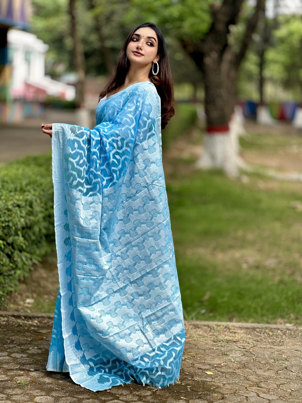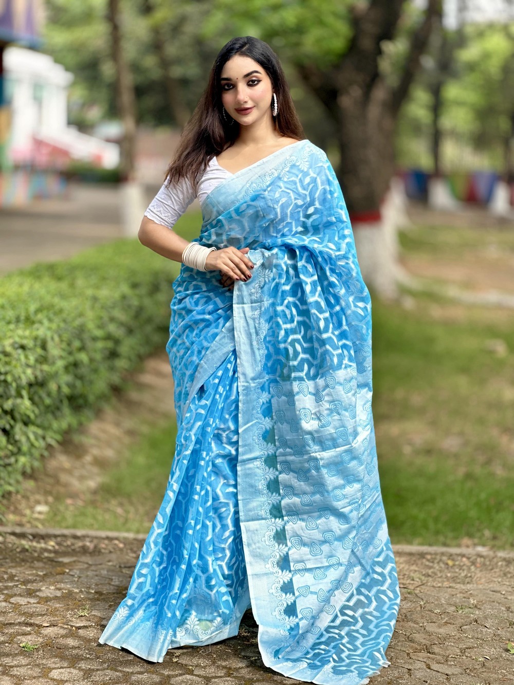 সম্পূর্ণ শাড়ীতে চিকন সূতায় অসাধারণ ডিজািইন করা।