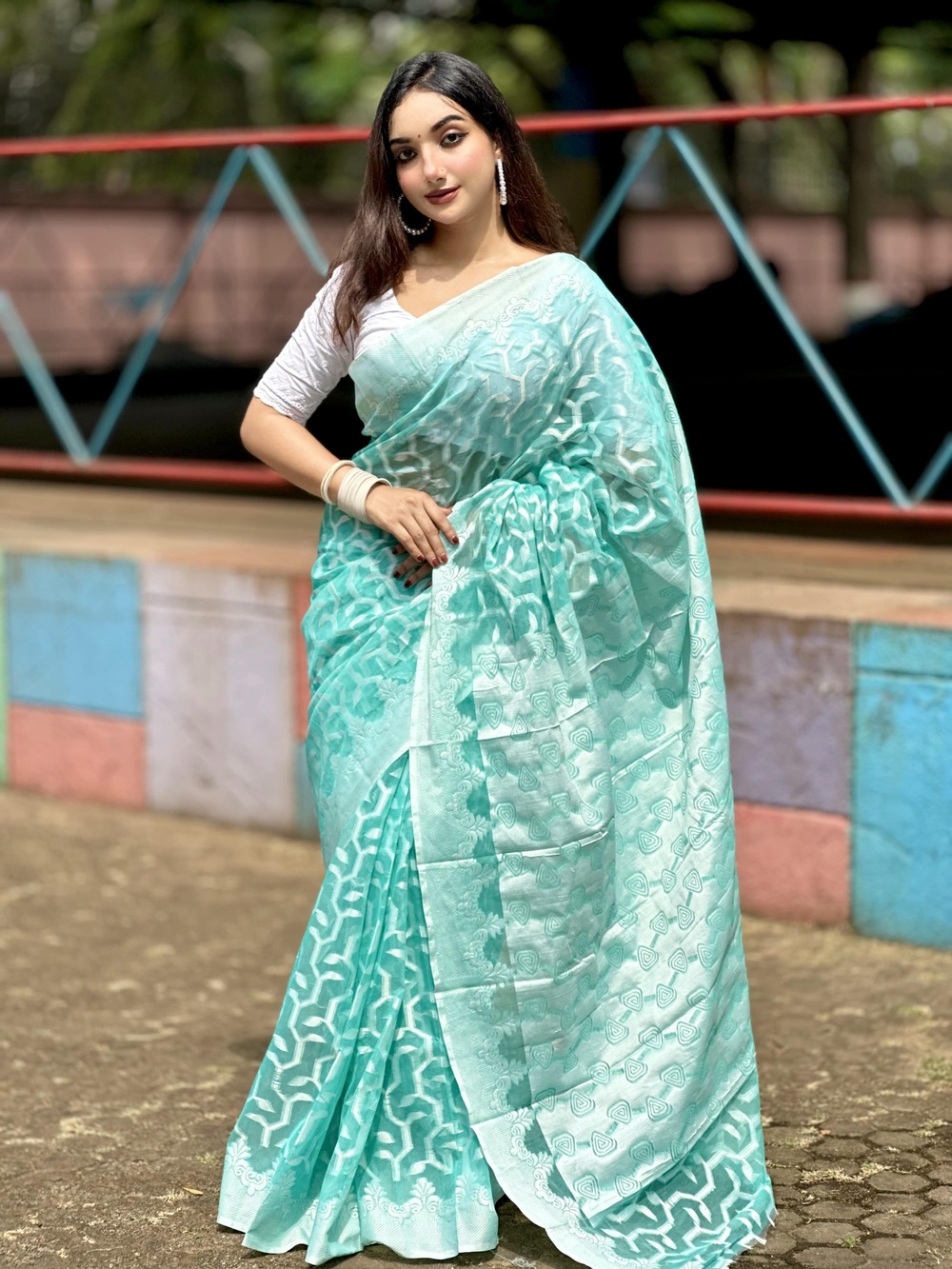 সম্পূর্ণ শাড়ীতে চিকন সূতায় অসাধারণ ডিজািইন করা।