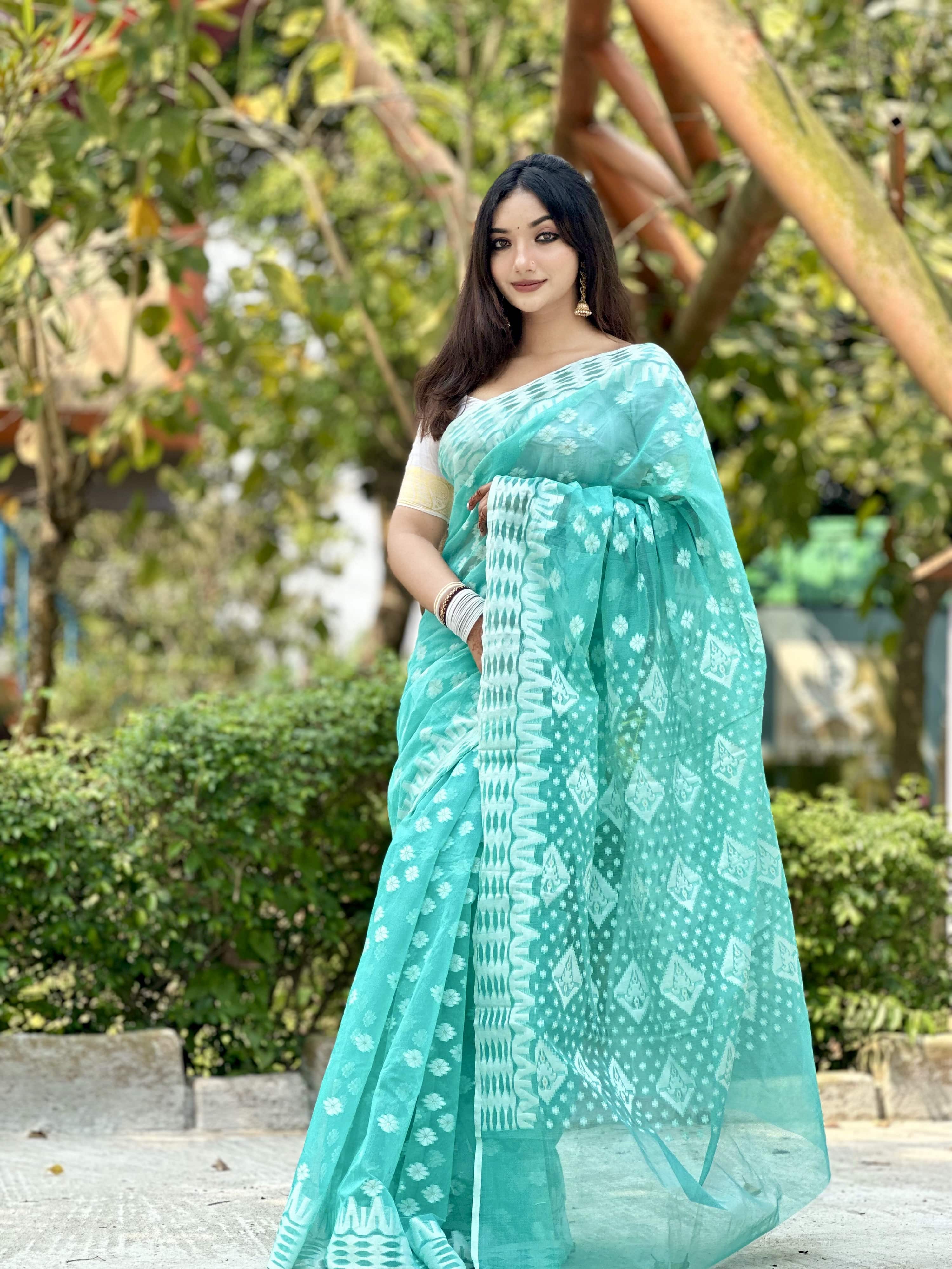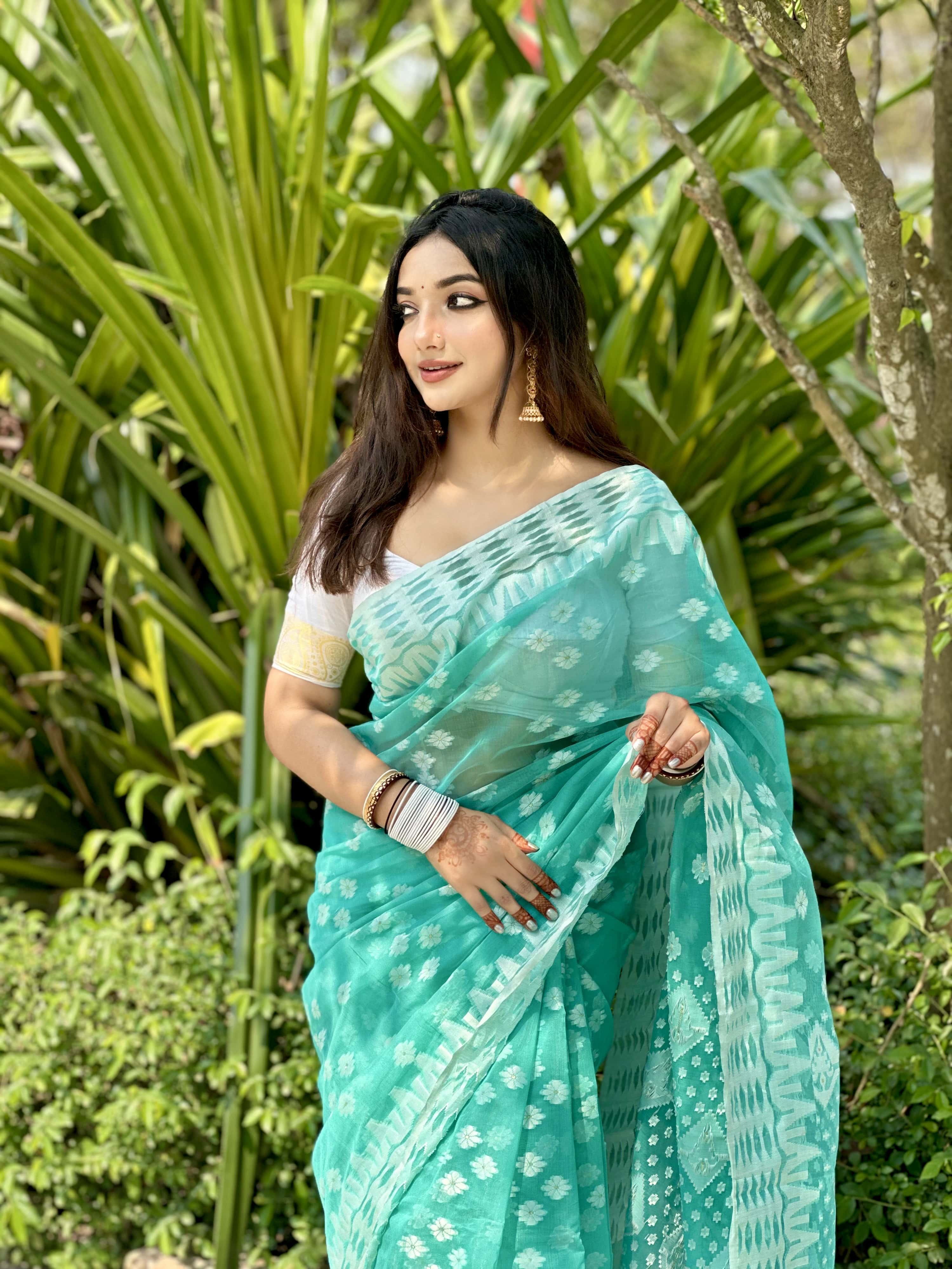মসলিন জামদানি শাড়ীর এর মধ্যে অসাধারণ সূতায় এর কাজ করা।